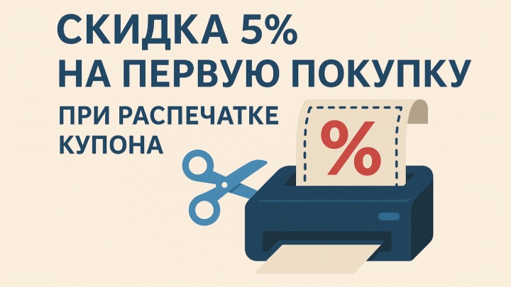 Распечатайте купон с нашего сайта и получите скидку 5% на первую покупку. Просто, быстро и без лишних условий. Ждём вас!
